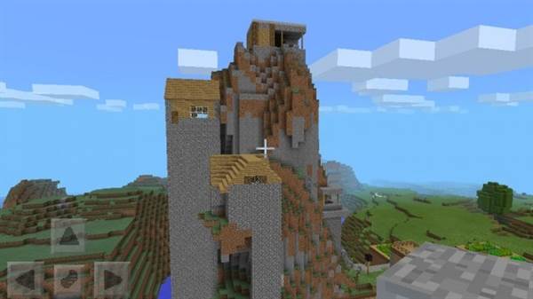 The surrounding areas of which you spawn in are what it seems like at first flat. But as you take an extra look around you will notice this mountain village nicely situated on a misplaced extreme mountain. Close to the mountain foot the village continues with a couple of farm fields and houses. But most of the village is actually located on top of the high mountain.