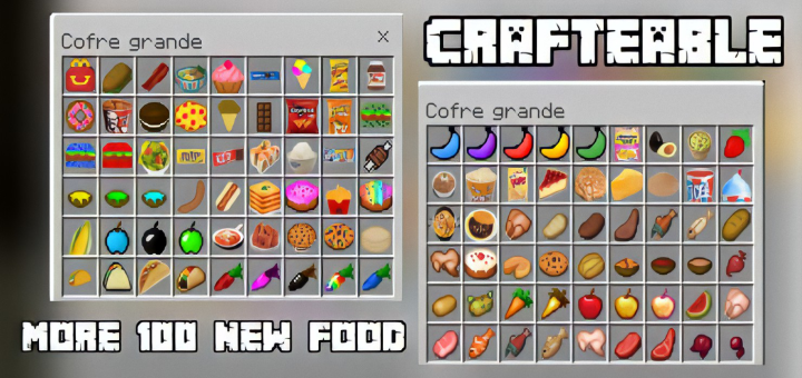 This add-on adds more than 100 foods to Minecraft Pocket Edition, each food has its own recipe, as well as its own effect and nutrition points