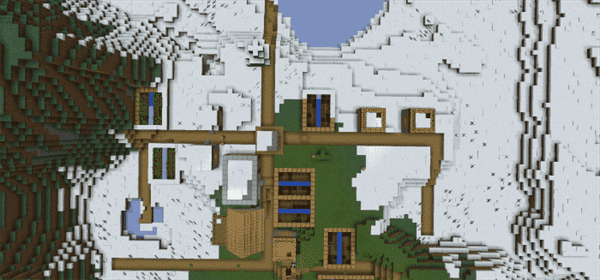 This is a seed where you will spawn in a winter landscape near a village which has been generated partly in the snow biome. The village is mostly covered with snow but it does have admittely some patches of grass, like one third maybe. The surrounding area consists mainly of open plains.