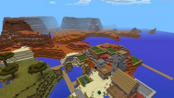 In this seed you will find a village situated in the middle of two different biomes: Mesa and Flatland. The way it is located close to the water makes it look like there is a harbor for boats or something. Perhaps it’s a village you could use to build something greater. It’s unique because normally you don’t find villages in Mesa biomes.