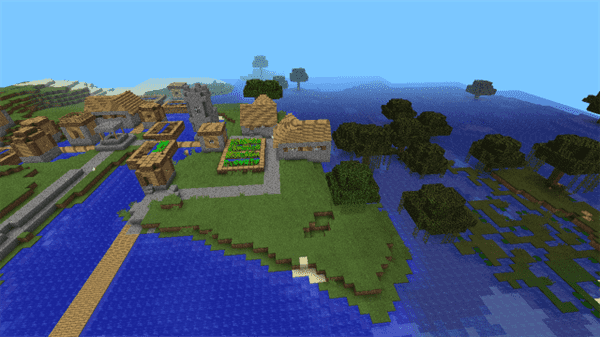 In this seed you will spawn close to a village on an island. The village is divided in two parts and both are equally spread across the island and the mainland.
