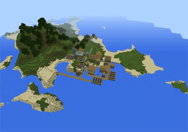 In this seed you will spawn on a larger island with a beautiful terrain consisting of a large hill in the center and a small village on one of the coasts.