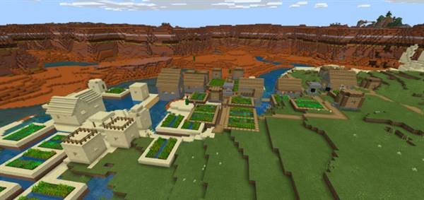 But if you follow the border of the Mesa Biome to the right, you can find a Triple Village fused to the Mesa Biome! One Village is a Desert Village, another is a Plains Village, and the third is a Zombified Plains Village! If you look at the dirt road in the edge of the Zombified Village, you can find the Mesa Mineshaft attached! Enjoy!