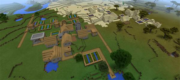 The first village which you spawn in is combined with another village which is a sand village. The surrounding area consists of a savannah, desert and plains biome. The double village is as a matter of fact located in all three of those biomes.