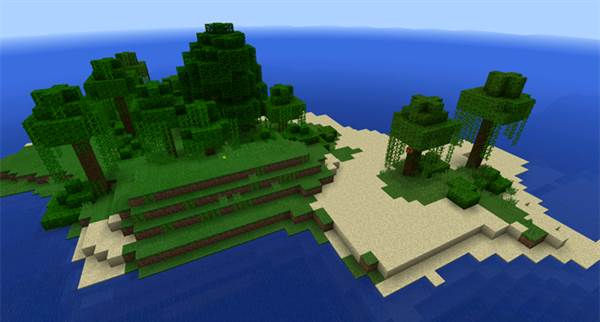 The spawn is on a smaller island which got a couple of jungle trees, mainly just short trees. But next to the small island is another jungle island which is much larger. And on that island you will find a bunch of tall jungle trees, caves and lots of other cool terrain to explore.