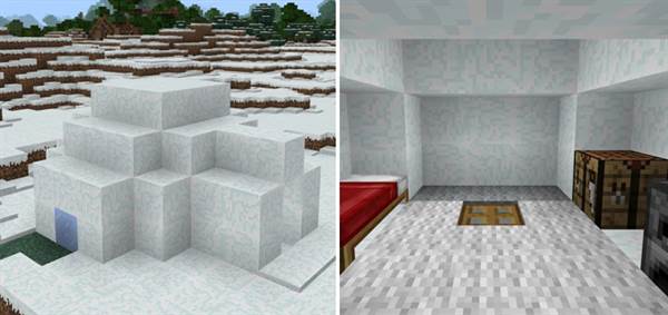 Inside the igloo you will find a bed, a crafting table and a furnace. Basically the essential things you’ll need for surviving. If you break one of the carpets on the floor then you’ll be able to find a secret trapdoor.