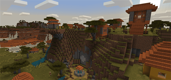 Going east of spawn will take you to a Ravine with two exposed veins of Diamonds and past the Ravine is a Shattered Savanna Plateau/Badlands biome combo!