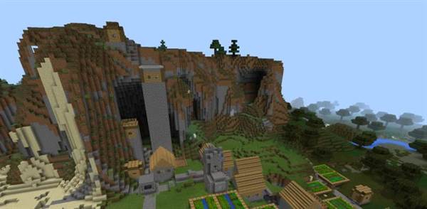 In this seed you will find a really cool mountain village and a witch hut at spawn. What’s great about it is that it’s generated on the edge of the mountain which causes some weird block for the houses as you will see if you look at the images further down.