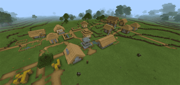 We have a several Villages and villagers, and also have a iron golem. As you enter the world and spawn in, you will have a good village infront of you with crops here and there, several housing for the villagers.