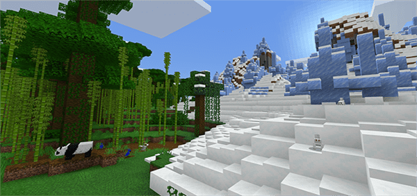 This neat seed works in both Infinite and Old world type where it spawns you near a Bamboo Jungle, Ice Spike, Gravely Mountain, and Flower Forest combo in Bedrock Edition!