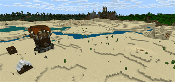 This amazing seed has several structures and biomes close to spawn which makes this a great starter seed to jumpstart your Minecraft journey! At spawn, you will find the elusive Bamboo Jungle to your right. If you go forward from spawn, you will find the Shattered Savanna biome next to the Redwood Taiga biome. But if you go forward and to the right in that diagonal direction, you’ll pass by a Jungle Temple and past that is a Flower Forest! If you go forward and to the left from spawn in that diagonal direction, you will find a Pillager Outpost next to a Desert Temple and Village! There is also a Desert Well right on the edge of a lake which looks pretty neat! Enjoy this sweet seed!