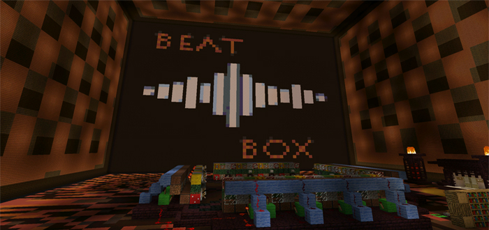 BeatBox (Drum & Bass) is a redstone powered beatboxing map. It comes with a preset song which plays on repeat. It can be customized using levers which are connected to 128 different noteblocks. Before entering the actual beatboxing room there’s a thorough tutorial taking you through all the steps required to understand how it works in its entirety.