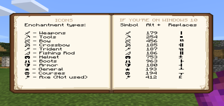 Since a few versions ago Mojang added certain emojis to Minecraft Java, however they are not available for vanilla Bedrock yet, but with this pack I add 12 characters for you to use in your enchantments, or signs in your world!