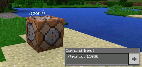 In this first example I am going to clone a command block. You can insert any type of command and in this case I added a command (/time set 15000) which will set the time of day to night.