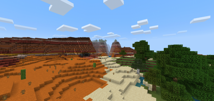 Of course you will first notice the huge Badlands/Mesa biome (whatever you wanna call it) in front of you, which has tons of resources underground like Iron and Gold for you to mine if you dig down enough. If you’re lucky, you might find a Mineshaft, too. It also generated a variant of the Badlands biome, called the Wooded Badlands. In case you don’t know the Wooded Badlands biome generates hills of Terracotta with trees and Course Dirt on the top.