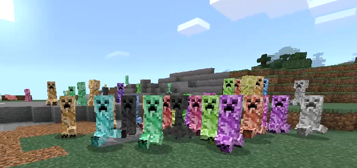 This texture pack makes up to twenty different colors of creepers spawn. This is a resource pack, so you can play this in a vanilla Minecraft world and still earn achievements.