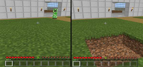 This add-on is mainly for those who wouldn’t mind normal Creeper behavior, as long as they aren’t able to blast you and your pets into oblivion if they do get the jump on you. That said, this add-on does still allow Creepers to explode, but their explosion radius is greatly decreased and the blast only damages soft blocks, such as dirt. Harder blocks such as stone are left unharmed by Creeper explosions with this add-on applied.