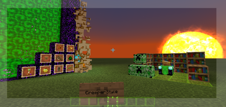CreeperStyle started as a simple texture pack, until I was given a list of challenges for the pack. So I set forth on said list of challenging tasks: Green to the in game UI (items slots in inventory and chests), My own sun, New moon phases, Custom health & hunger icons, Custom ores, Custom enchant table & book, and so much more as I’m going to leave some for you to find as you play…. As stated above I am already working on the behavior side of the list. Coding is not one of my strengths, however thanks to online videos and chat forums I am getting the hang of it. I have been working to add a custom item as well as the recipes for others. The list also challenges me to mod the coding for the current mobs as well.