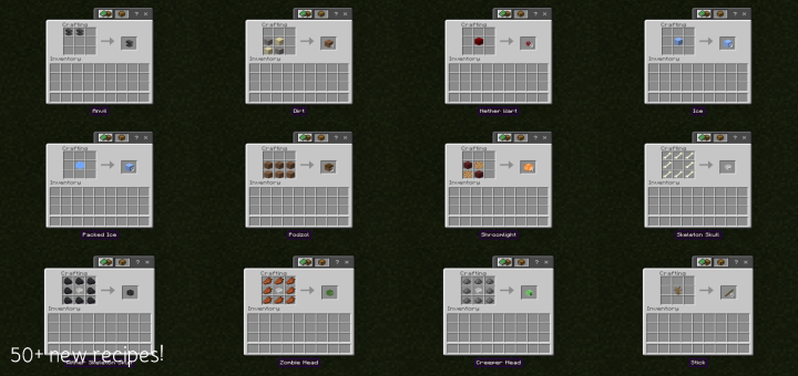 This addon adds 36 different crafting recipes for blocks and items that are previously not obtainable by crafting. Want to craft horse armor, a trident or even a nether star? This addon adds these recipes. [BETA]