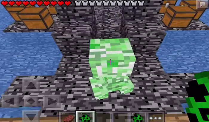 At spawn you will be able to collect steaks, gear and creeper spawner eggs from chests. Put on the gear and eat a steak after every jump. Use the spawner eggs to place the creeper where you want it to explode.