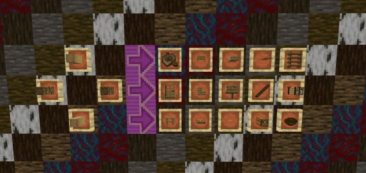 The door, stairs, trapdoor, slab, button, pressure plate, stick, chest, ladder, crafting table and bowl recipes are how you normally craft them. Also, the original recipes are still in place, this pack doesn’t remove anything, it only adds. There aren’t any recipes for wooden tools though.