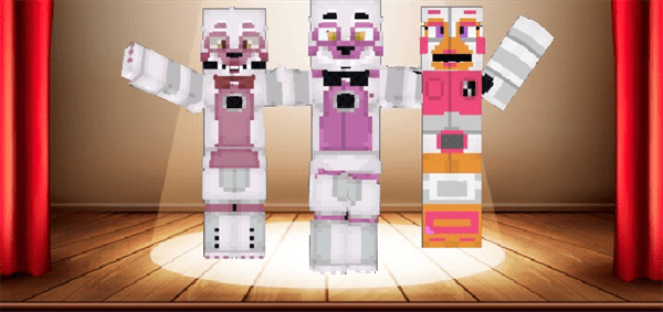 This skin pack adds most of the Fnaf SL animatronics this pack does not include the jumpscare forms of eny of the animatronics most of the skins are not hd but a few are HD and this adds 12 fnaf sl animatronic skins.