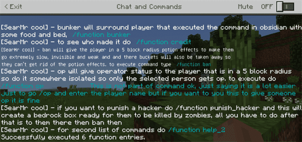 This function pack introduces many new features from a bunker to house and much more, one feature called banned is not fully capable of stopping hackers but it can keep them at bay. For a full list of all the functions type in /function help and it will show all the commands
