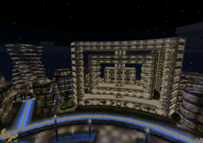 The Futuristic City got plenty of housing complexes, a university, a stadium and a large area for residential houses. Every building is decorated with glowstones which make the city look the best during nighttime when the moon shines bright, overlooking the city. The structures are built in abnormal shapes which would make a real life architecture shiver, but for the most part everything still feel quite real but extremely expensive to build.