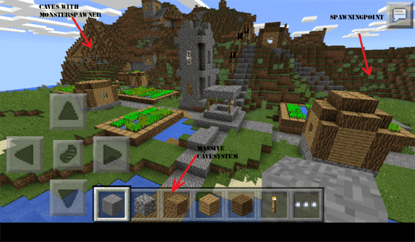 The seed includes a mountain village at spawn which connects both to a tunnel leading to a zombie spawner and to a really big cave system. All in all it’s a very unique village as it’s generated on the side of a mountain.