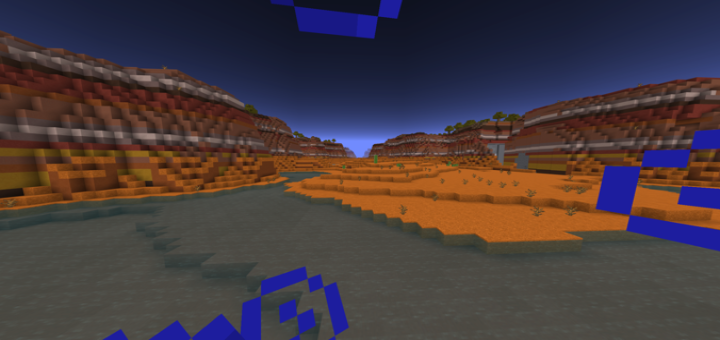 You spawn in a lake between an oasis and the walls of the valley. Encompassing the oasis is a tall mesa with little plant life and a detailed river system. As you travel past the mesa in all directions you find monuments, outposts. Ravines, boats, minshafts, and multiple villages. The land is quite dry, spare a couple plains, a vast corner of ocean, and a random group of icebergs, it mostly consists of Mesa, Sahara, and desert biome.