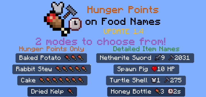 This pack does exactly what the title says. The amount of hunger points given for consuming a food item is now shown in the name of the food item! You can also choose for it to show the amount of time needed to eat it, and also armor points a piece of armor gives you, and the full durability of an item as well.