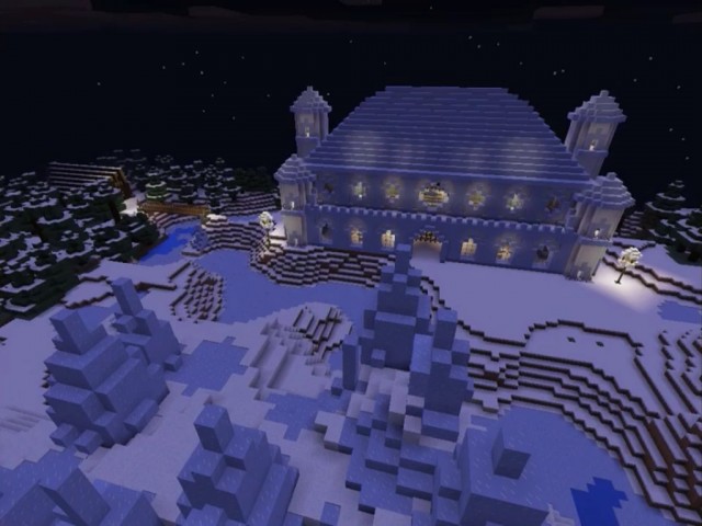 The Ice Castle is a beautiful medium sized castle situated far out in the deep forests of Minecraft. It lays on the border of two different biomes: a forest and an ice spikes biome both of course in a snowy landscape.