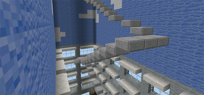 Infinite Stairs is a challenging parkour map where you have to walk (and jump) stairs to ultimately get to the finish line which is at the top in the sky. Some of the steps in the staircase are missing so you always have to look out for those and jump when necessary. To play the map according to the rules you should set a timer before starting and make sure to reach the finish before 10 minutes have past, otherwise you will fail.
