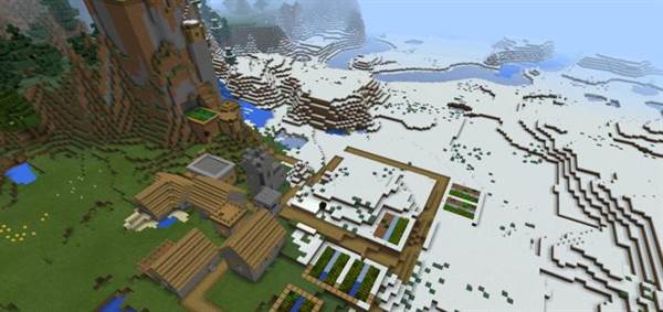 As soon as you’ve spawned you will see the village just a bit further ahead. The village is divided in two biomes. One being in a plains biome and the other half in a snow biome. Some farms and houses has been generated on the side of a mountain which surely makes the seed look even more cool.