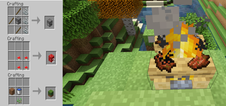 Changes to smelting include making glass, stone, and smooth stone available to smelt in a blast furnace. Everyones favorite addition, rotten flesh to leather also makes an appearance, available in a furnace, smoker, and both varieties of campfires. You can also now dry sponges with campfires. A bug makes it so you can’t see them well their drying but will pop off just fine when done.