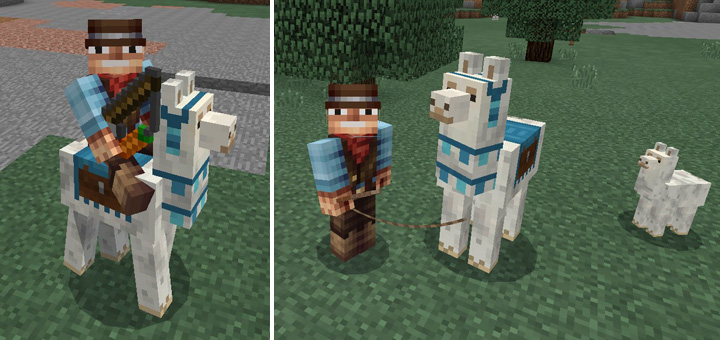 This addon adds a new animal to the game called a llama. It’s a quite fun animal with a unique set of behaviors. They are probably most known for their spitting and that they will do in Minecraft as well. For example, they’ll spit at wolves and creepers but also players who treat them badly. But the best features are that you can ride them also make them carry your items!