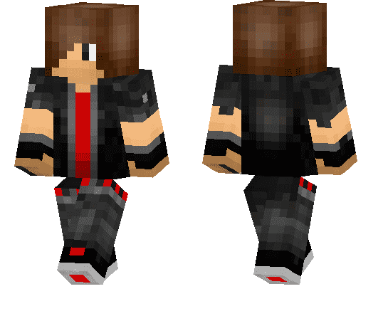 Brown hair, red shirt, black jacket, grey pants, black gloves.
