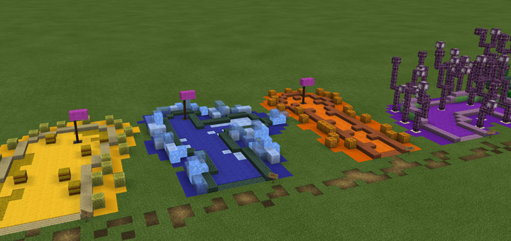 This map includes 10 different minigolf courses and each course is based on a different color of the rainbow. To play minigolf in Minecraft you need to throw the ball item in the hole (hopper), and it’s preferable to do it in the least amount of tries. As you throw the ball on the ground it will start sliding due to the ice underneath the carpets. There are different obstacles on each golf course. You can play with map alone or with other players.