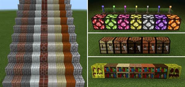The MCPE+ Mod adds more than 100 new blocks to the game. The majority of them are blocks designed for decorational purposes. For example, some of them include beautifully patterned brick blocks which can be used for building magnificent castles. But there are also more simple blocks like bookshelves in new colors and a portable crafting table.