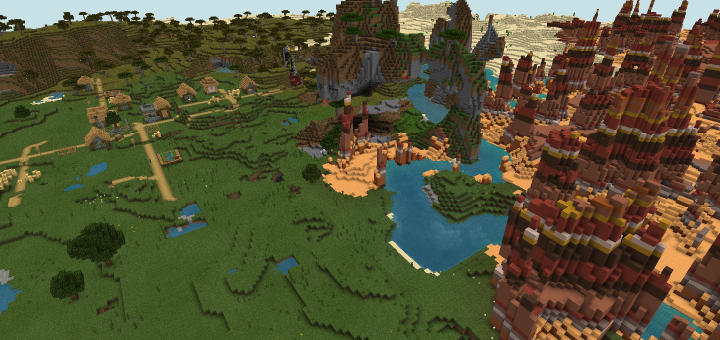 Spiky Mesa and 2 different villages, one with villagers, second with zombies. Has also desert, savanna, and dark oak forest. Spawn is exactly at the edge of the Mesa spikes.