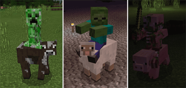 This addon greatly increases the spawn rate for jockeys as well as adding new combinations which previously didn’t exist. Hostile mobs (e.g. creepers) will first mount an animal if one is found in its surroundings before attacking a player. This is actually not an advantage to the player because the mount will greatly increase the hostile mob’s attacking abilities.
