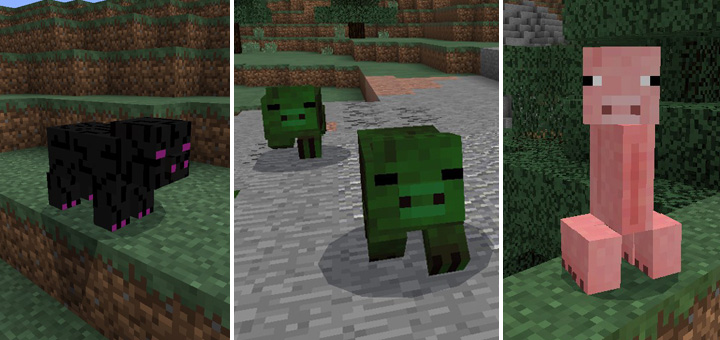 The EnderPig (replaces the mooshroom) behaves and looks similar to an enderman. It’s also quite fast which makes it actually a kind of dangerous mob to come across.
