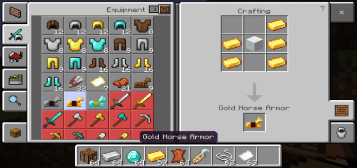 This Addon adds some crafting recipes for items that you usually can’t craft like horse armor and saddles. Addon for 1.12+ requires “use experimental gameplay to be enabled to work”. Works on all Minecraft bedrock platforms