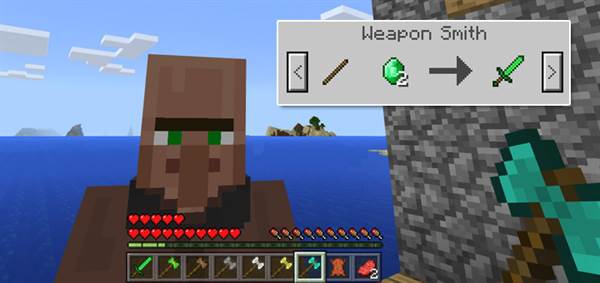 All weapons are sold by a new merchant known as the Weapon Smith. (Transform any villager into a Weapon Smith by using an Iron Ingot to interact with a villager.)