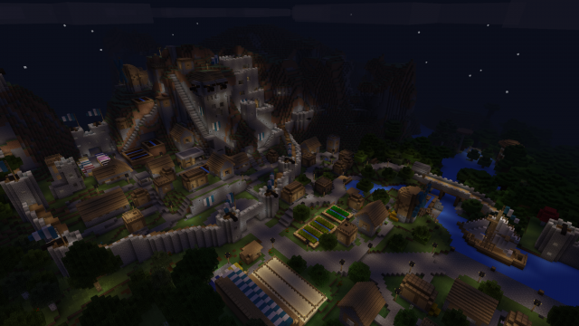 This castle resembles how they were built hundreds of years ago. Walls made out stone and watch towers to see enemies quickly. The castle is built in an advanced terrain with lots of extreme mountains. It is likely it is a seed the creator has found with a village and built a castle on top of it.