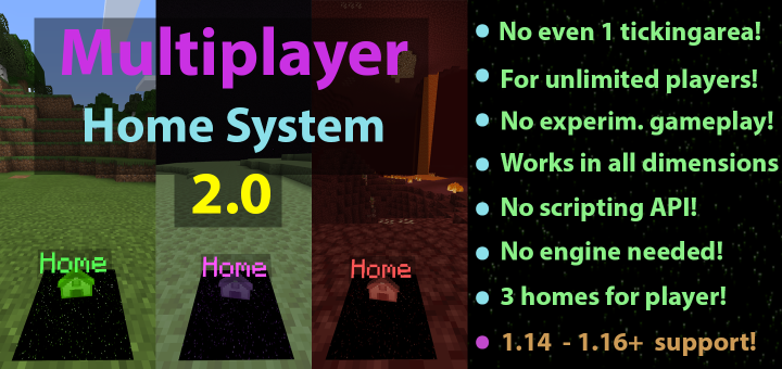 World’s first home system add-on for multiplayer! No tickingareas, No experimental gameplay (from 1.16+), 0,0001% bug chance, Absolutely does not create lags, for UNLIMITED player count! No scripting API needed, No engine needed, Works in all dimensions and more!