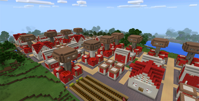 The structures in the village look similar to the ones that exist in normal villages but with some additional structures like the tall houses looking like champignons. If you enjoyed this map then you might like to give this other mushroom village a try.