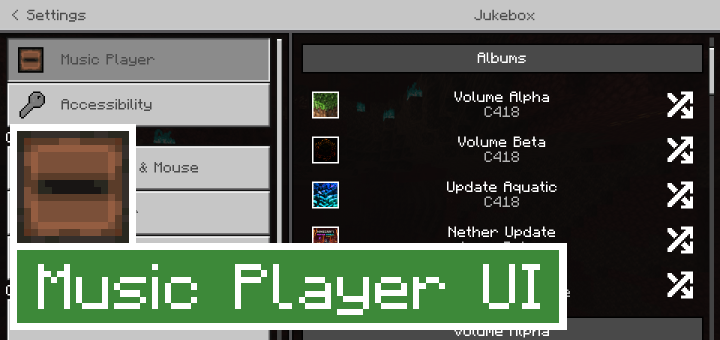 This pack allows you to play any song from Minecraft in any situation using a music player tab in the settings menu. If you enjoy certain Minecraft songs and want to be able to hear them whenever you want, this pack is for you!