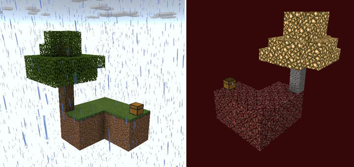Start off in the overworld on an island in the sky. The only things you will have are the items found in the chest and whatever blocks you can find on the island (and surrounding terrain).