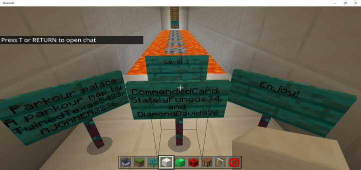 Welcome to Parkour Palace, a parkour map that has all kinds of levels! of all kinds of difficulties! It is difficult, but possible, with many challenges and trick levels too.